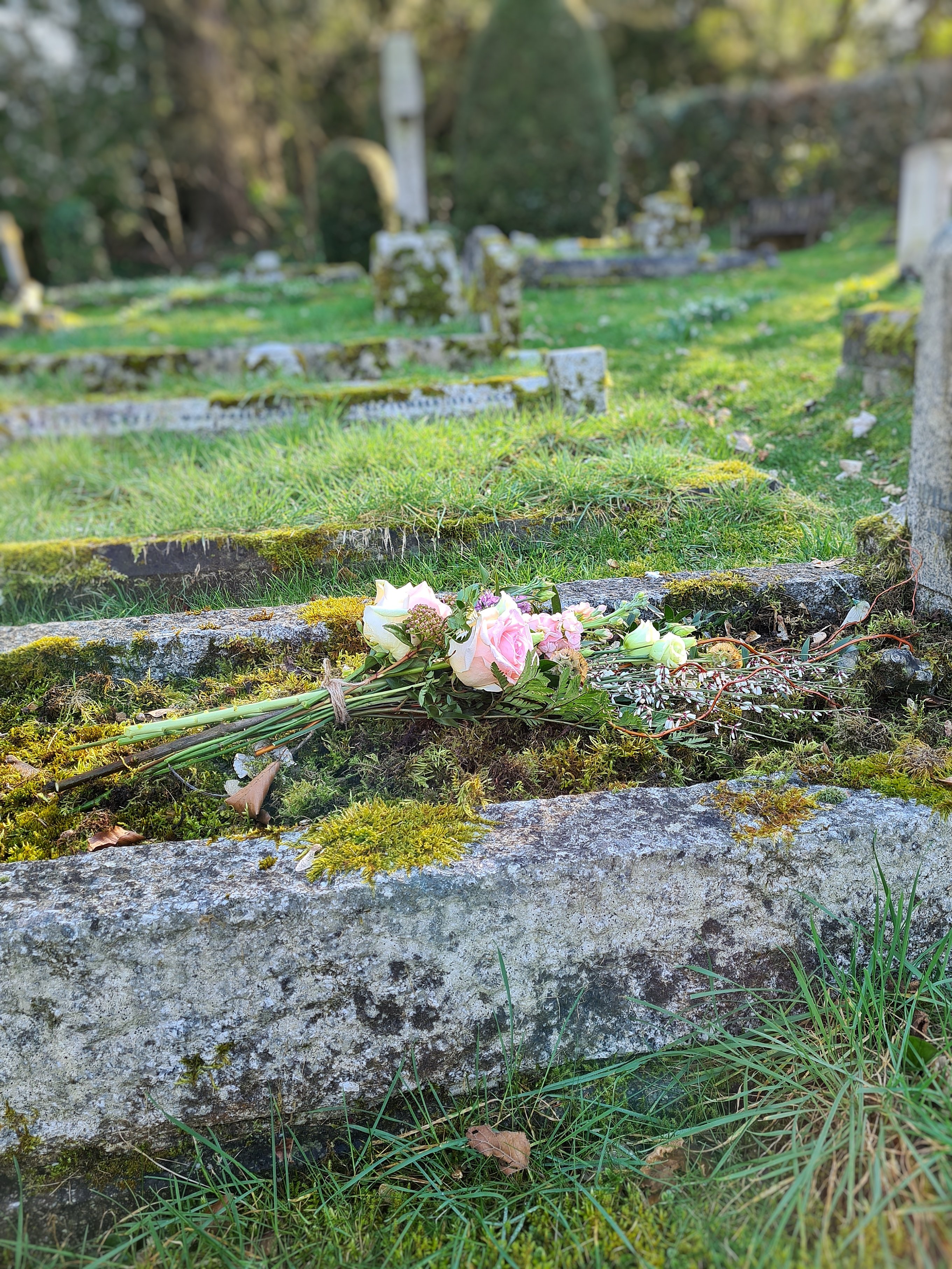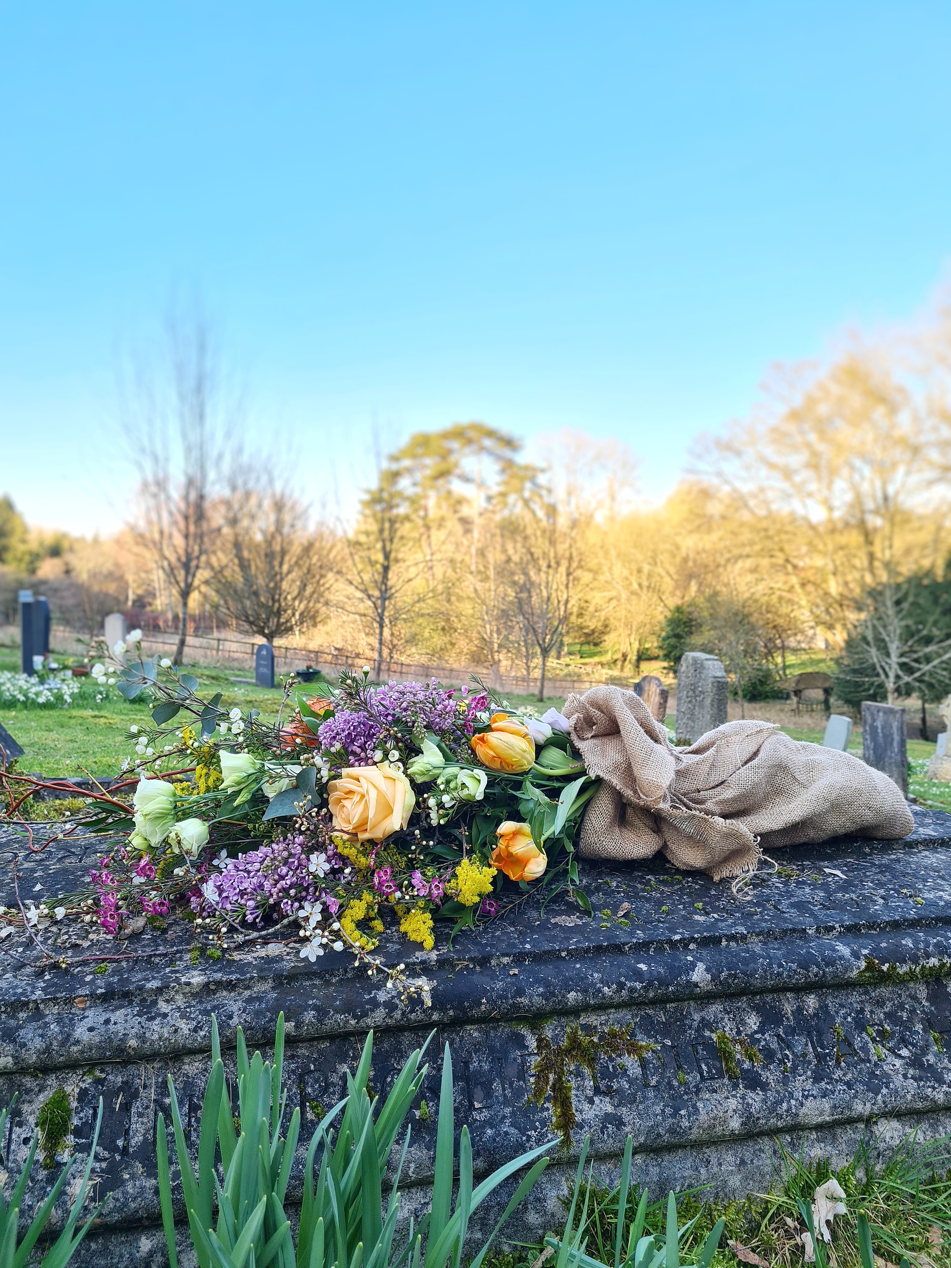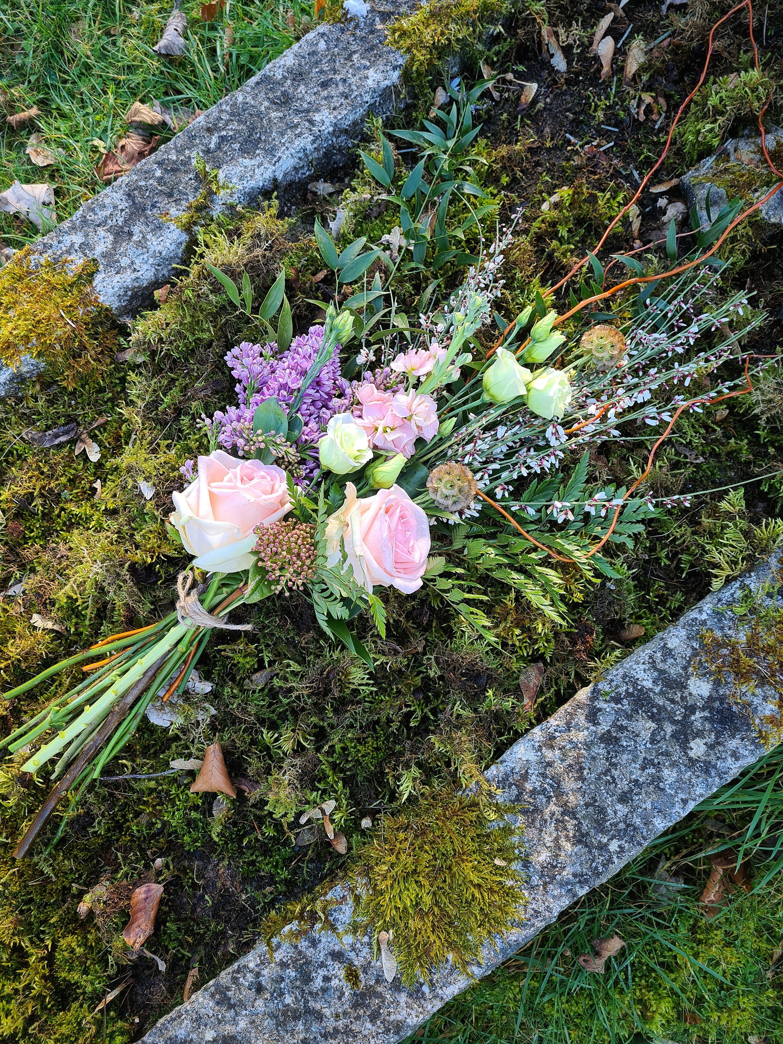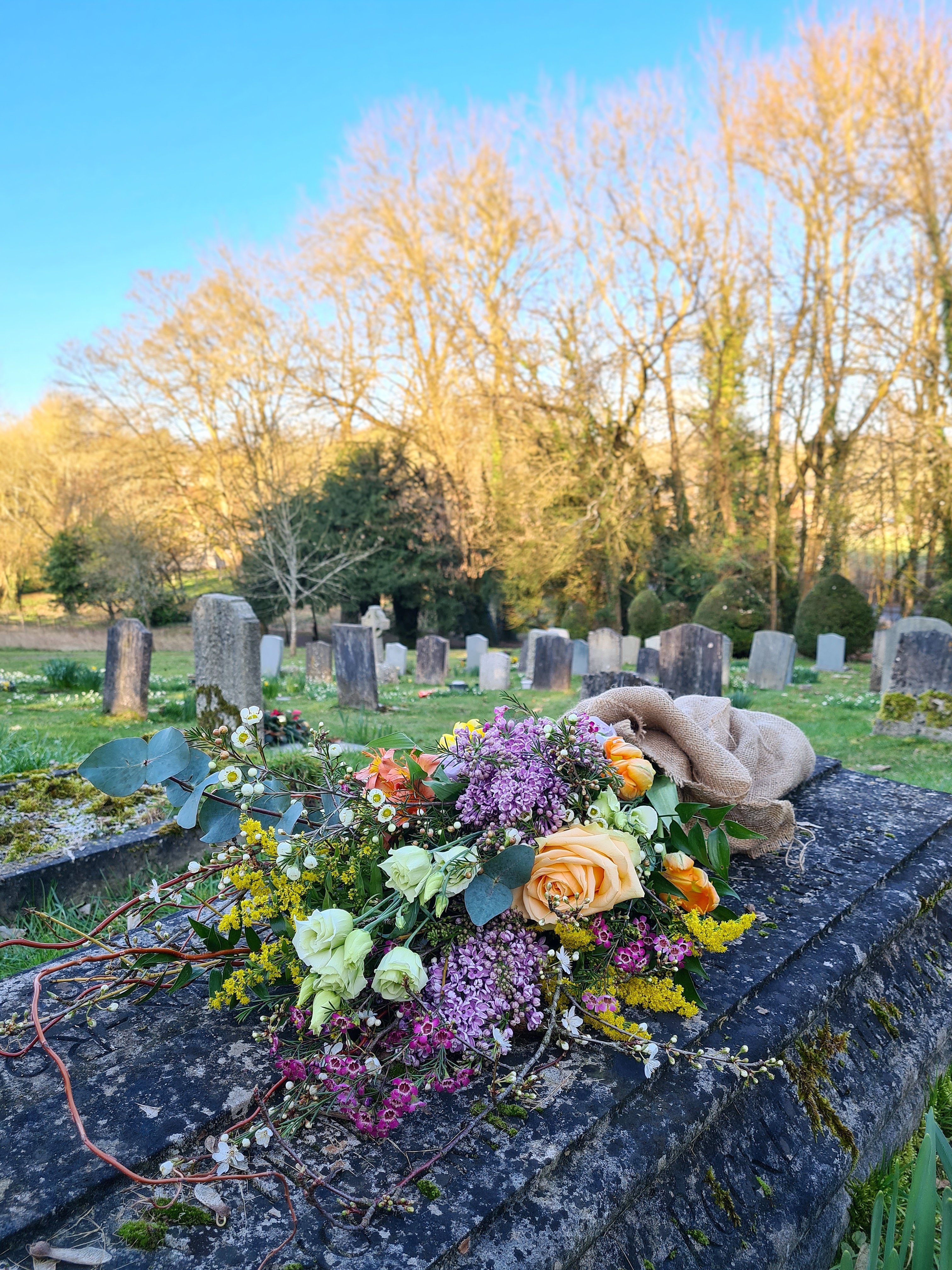 This is a flat-backed, one-sided tied bouquet, built onto branches to give it structure and shape. This means it can be easily placed on top of a coffin or grave or even a table.