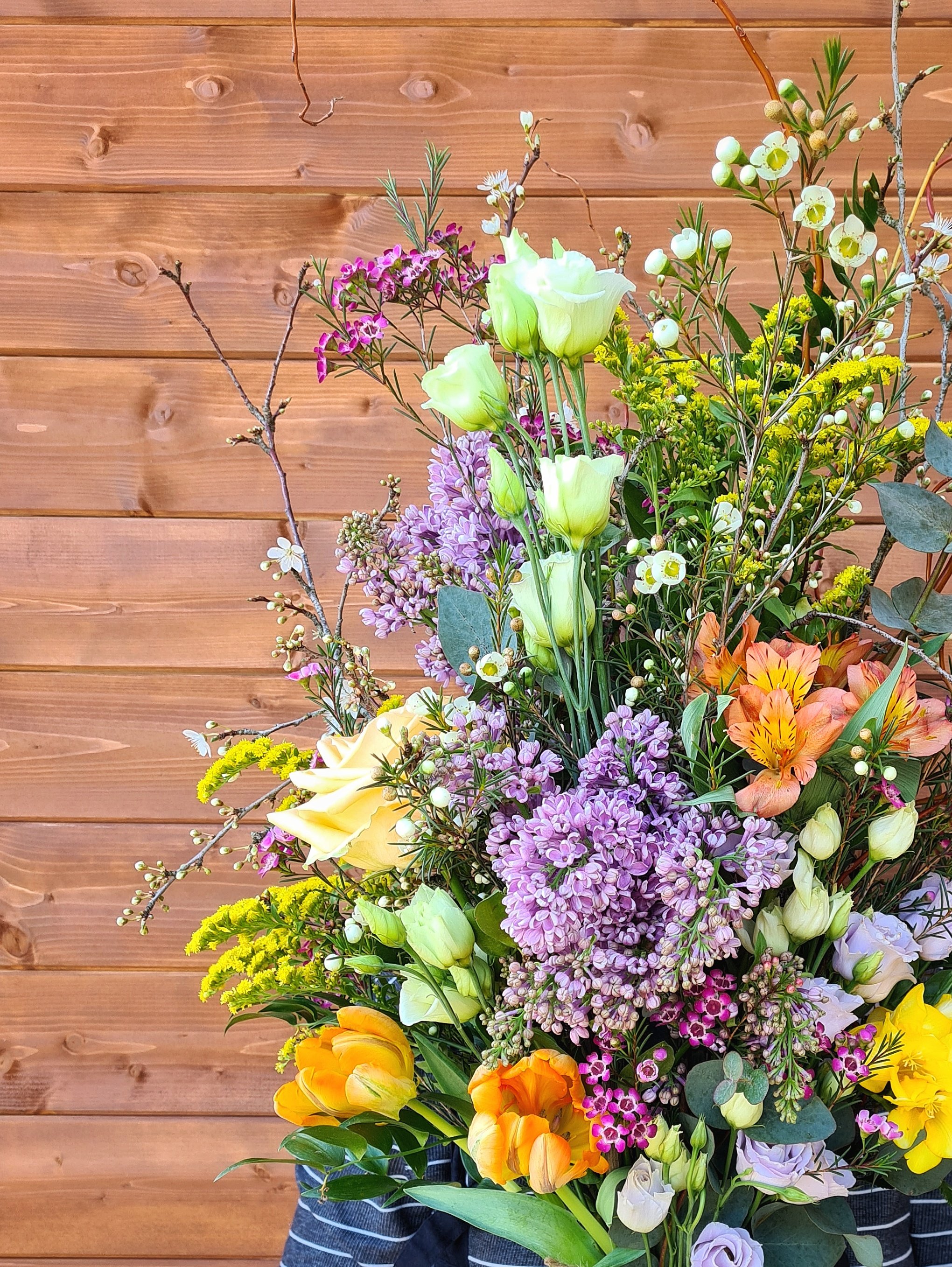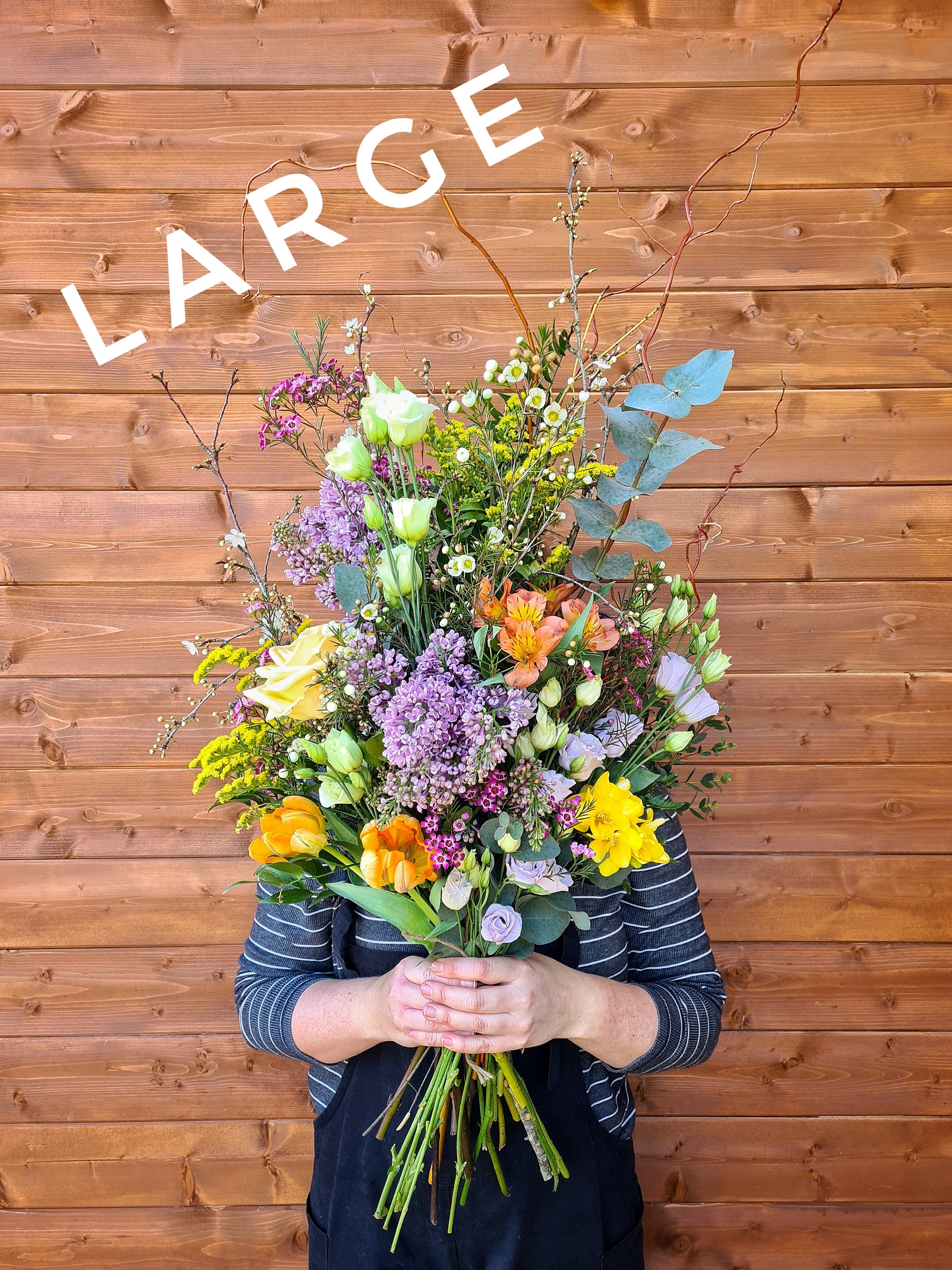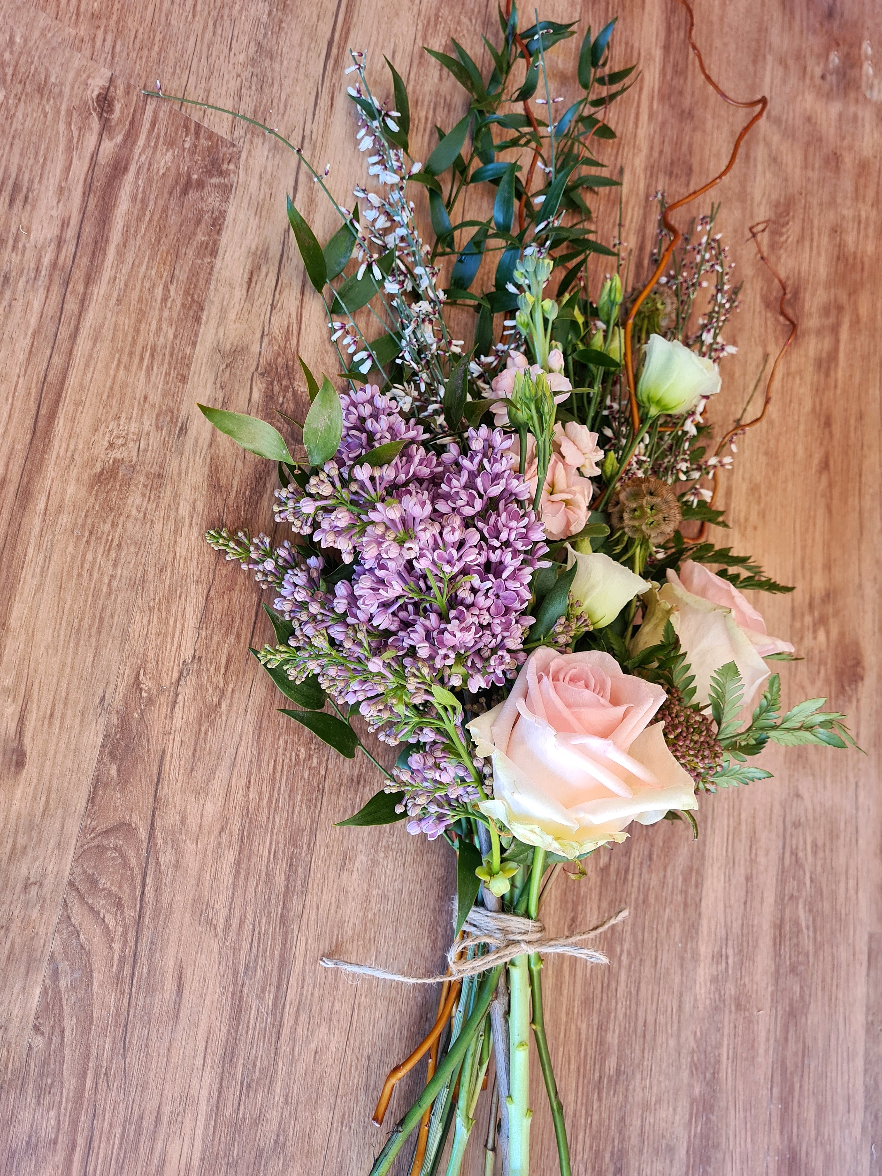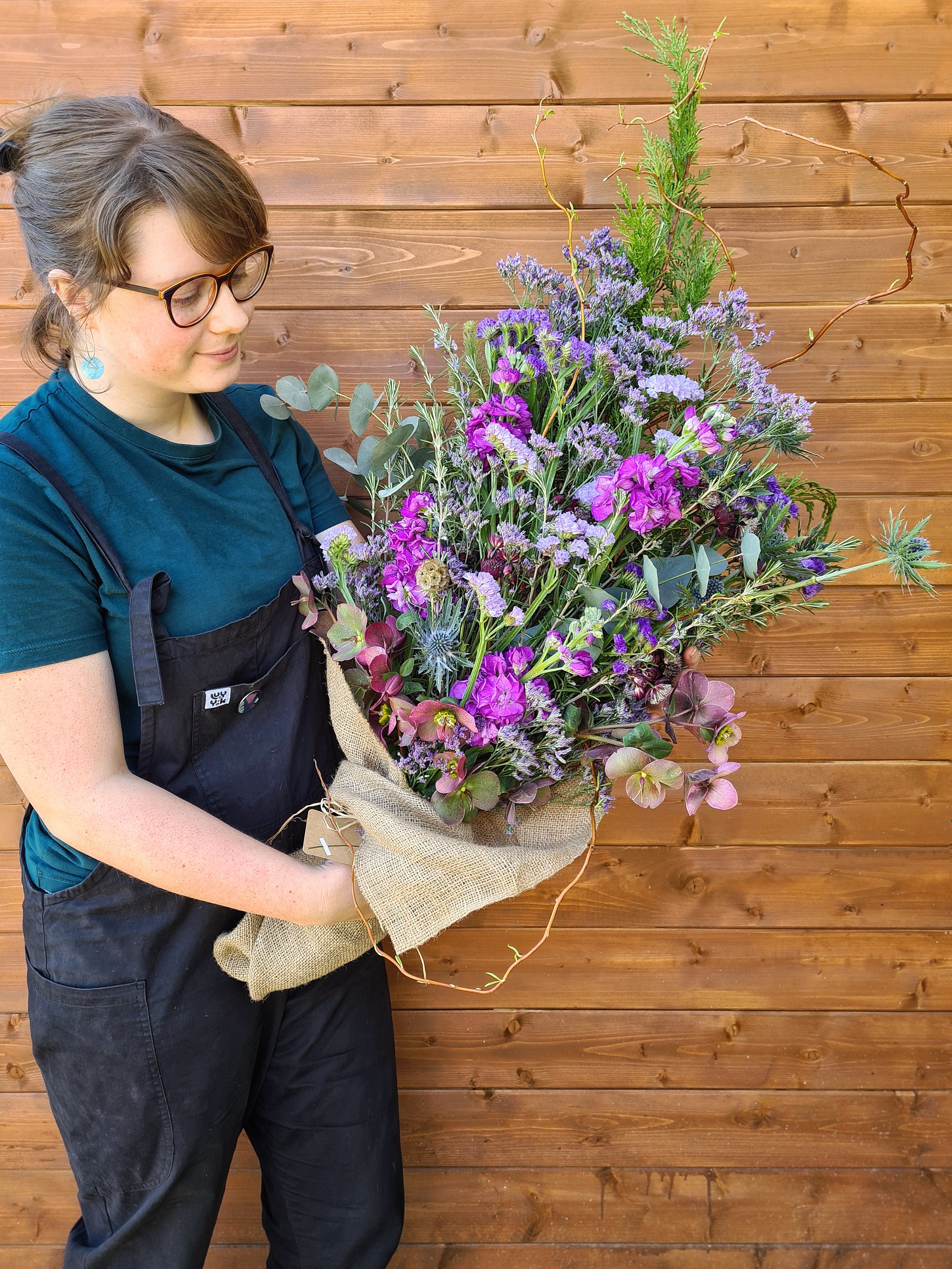 This is a flat-backed, one-sided tied bouquet, built onto branches to give it structure and shape. This means it can be easily placed on top of a coffin or grave or even a table.