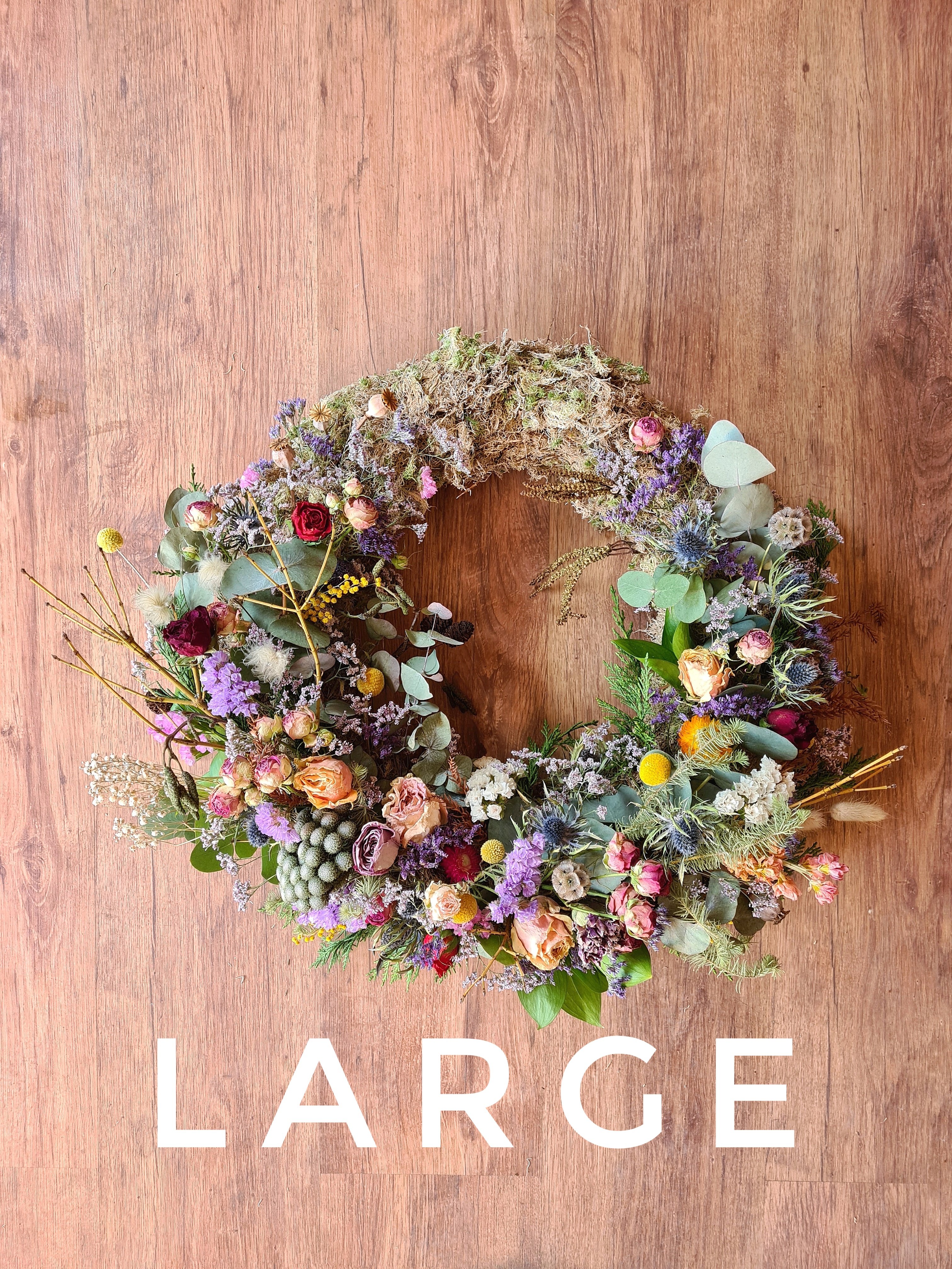 The small sized wreath is roughly 30cm in diameter. A large sized wreath is roughly 45cm in diameter. (The size may vary slightly depending on the foliage and flowers I incorporate into each individual wreath.)
