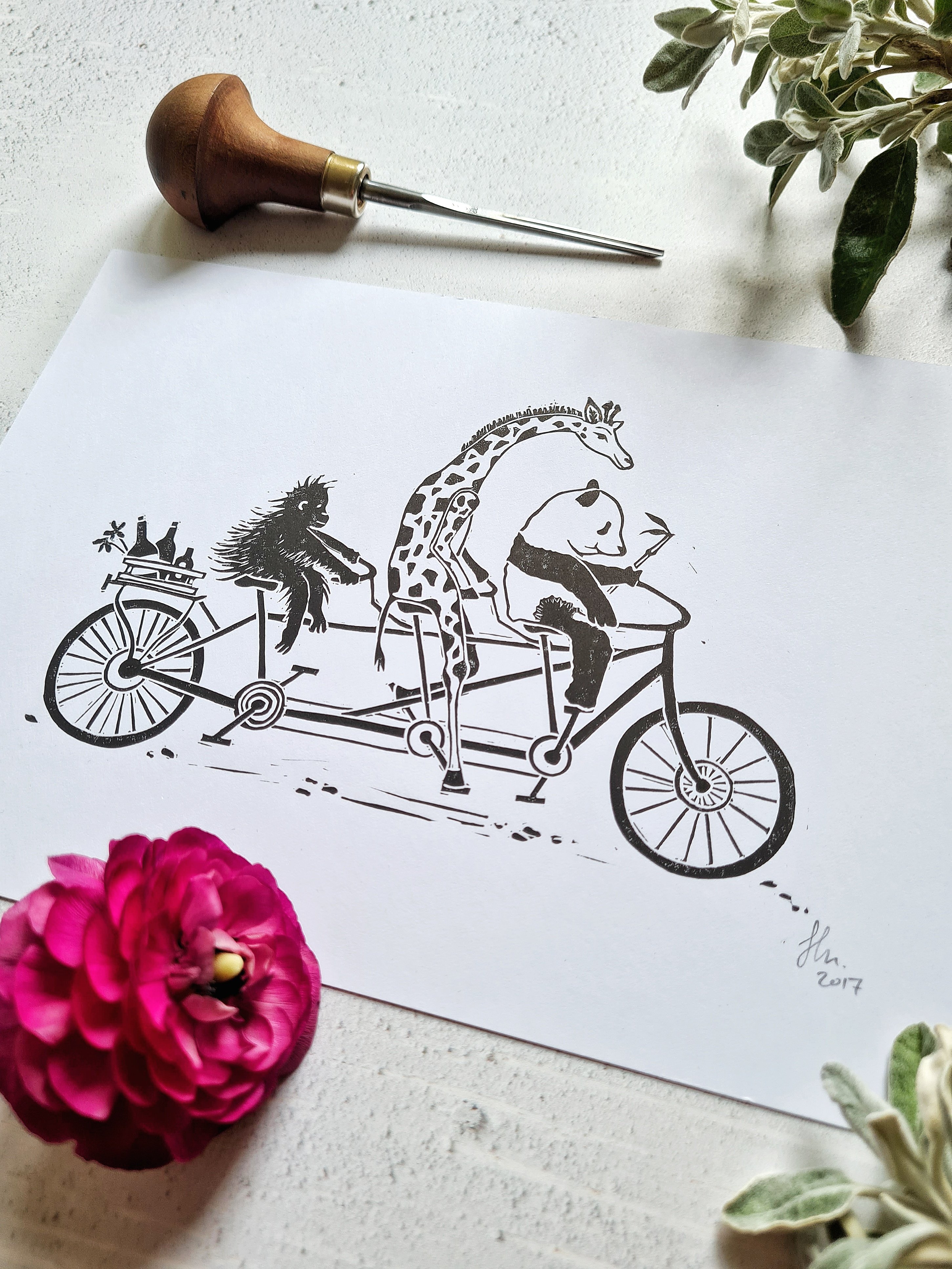 Let me tell you a quick back story to this fun little print. After visiting the Berlin Zoo years ago, I was so inspired by all the animals; I knew I needed to make a print of them. So I imagined how they might make their escape and my mind immediately went to a three-man bike (naturally).